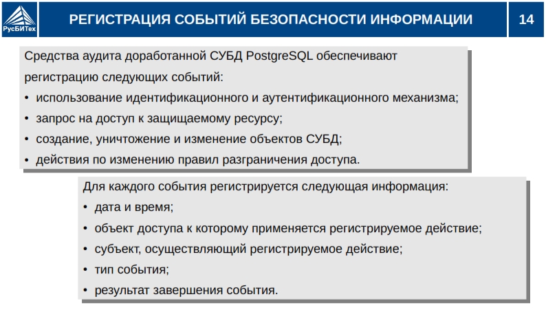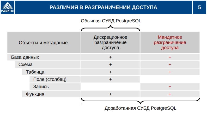 • Дискреционное разграничение доступа субъектов доступа к объектам базы данных (таблицы, схемы, функции, триггеры, виды, счетчики).