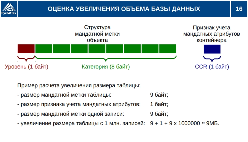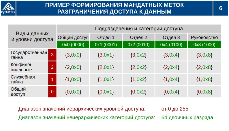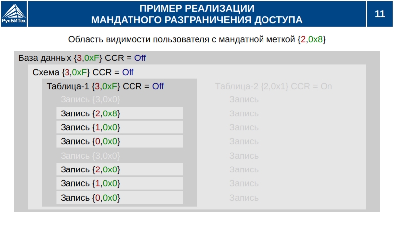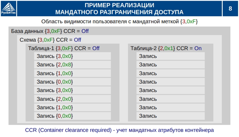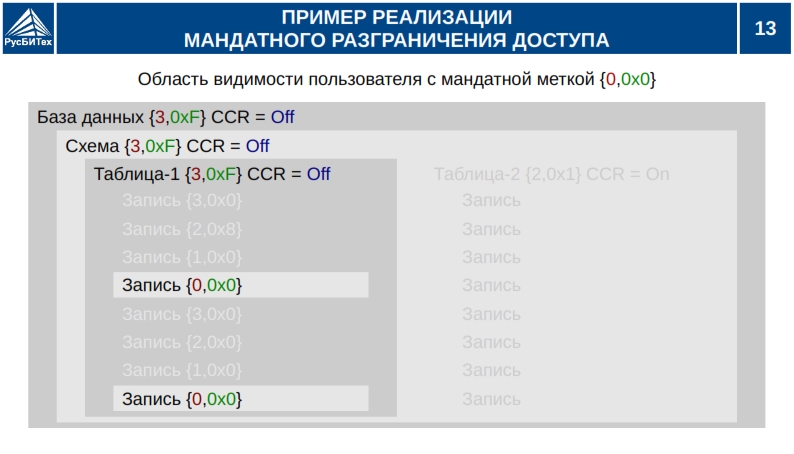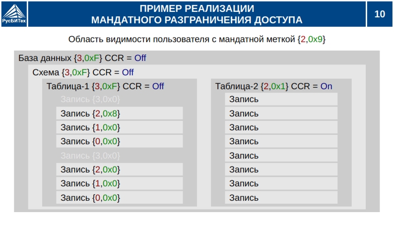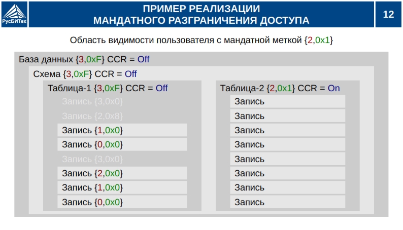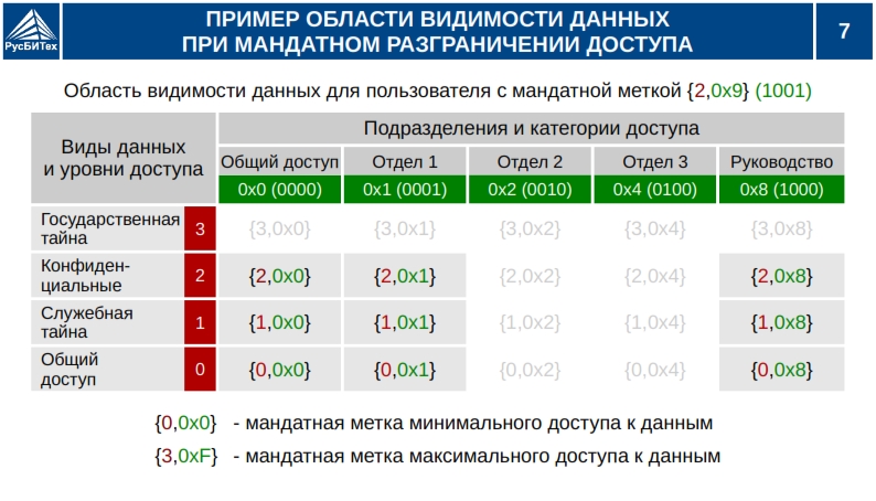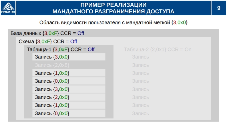 • Мандатное разграничение доступа субъектов доступа к объектам базы данных (таблицы, виды).