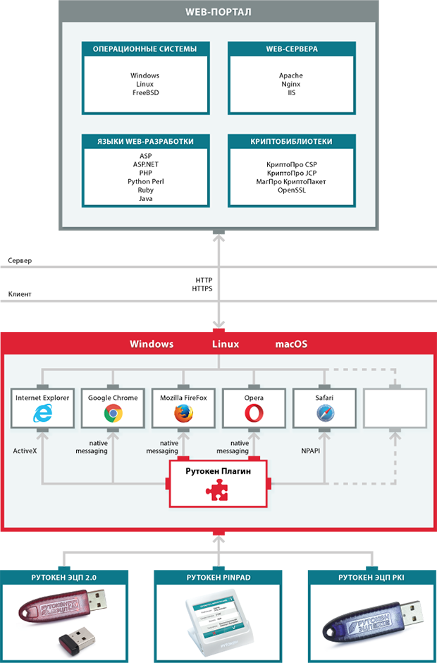 Рутокен Плагин в качестве средства криптографической защиты и строгой двухфакторной аутентификации использует USB-токен или другое устройство, в котором аппаратно реализованы российские криптографические алгоритмы. Для работы в контексте браузера используются кроссплатформенные и мультибраузерные технологии, позволяющие одинаково удобно работать с электронной подписью в браузере вне зависимости от используемой операционной системы.