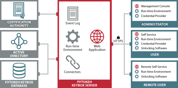 - Database. База данных Рутокен KeyBox. В текущей реализации вся информация хранится в каталогах Active Directory (AD). Информация об учетных записях пользователей так же берется из каталогов AD, отдельно добавлять пользователей в систему не надо. При хранении данных в AD не требуется расширение схемы: все данные локализованы в отдельном контейнере.